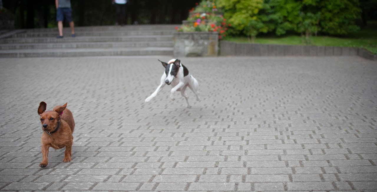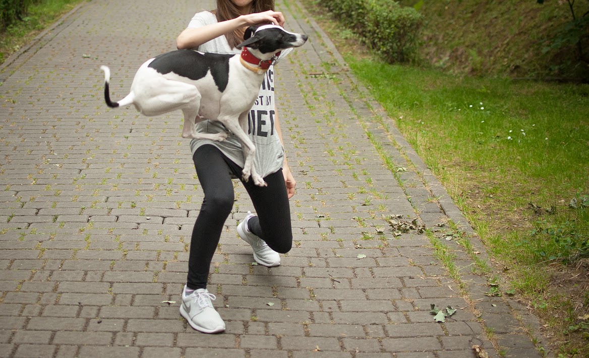 Na początku spotkałyśmy mieszankę jamniczka o imieniu Zula, była to suczka, którą Lola musiała oczywiście pomęczyć, potem poćwiczyłyśmy trochę podskoków, odbić od ciała i sztuczek, czyli głównie zmiany pozycji, które muszę przyznać wyglądają teraz o niebo lepiej niż kilka miesięcy temu, oprócz tego jeszcze obrót wokół własnej osi, ale tym razem w przeciwną stronę zegara.